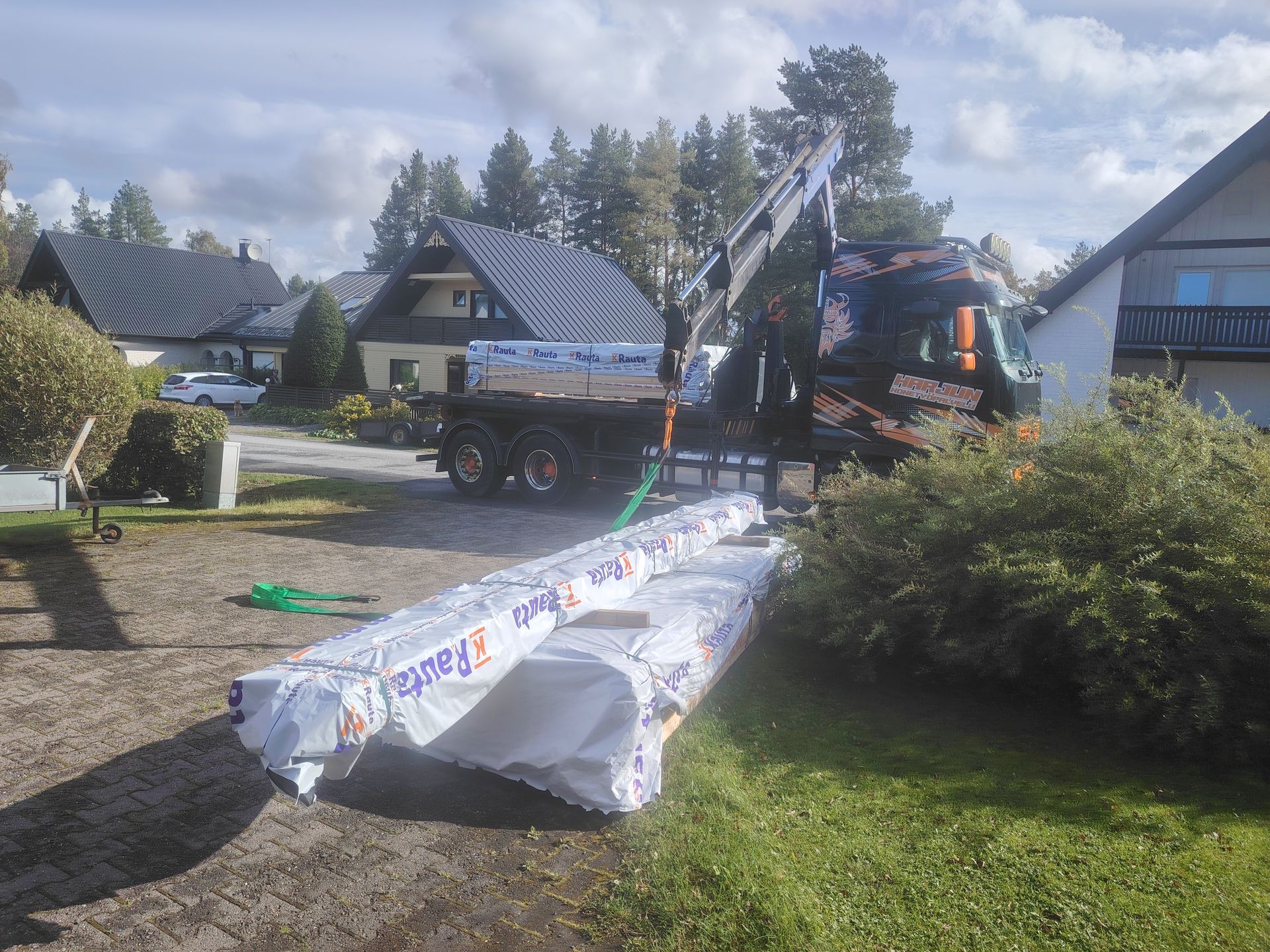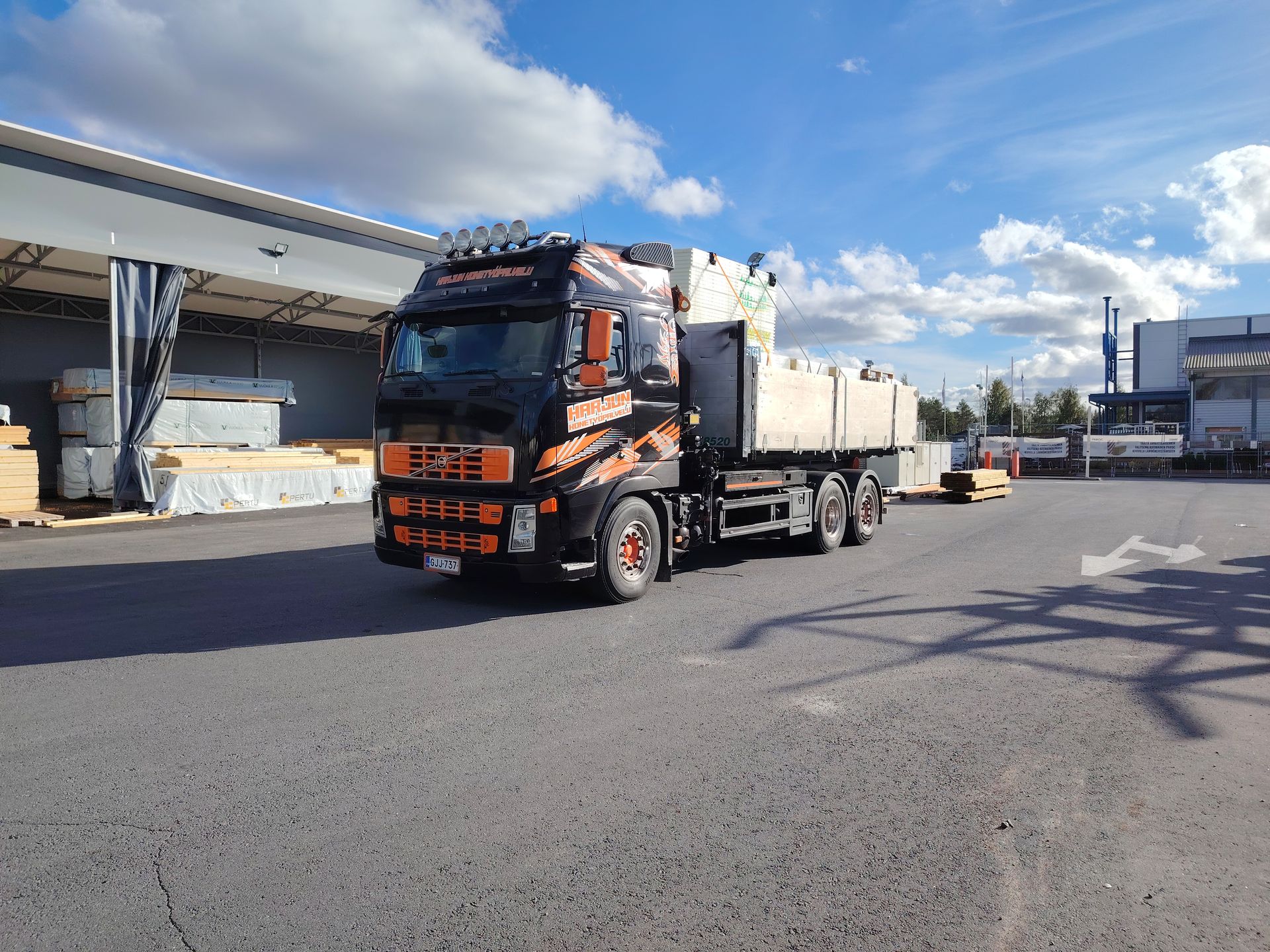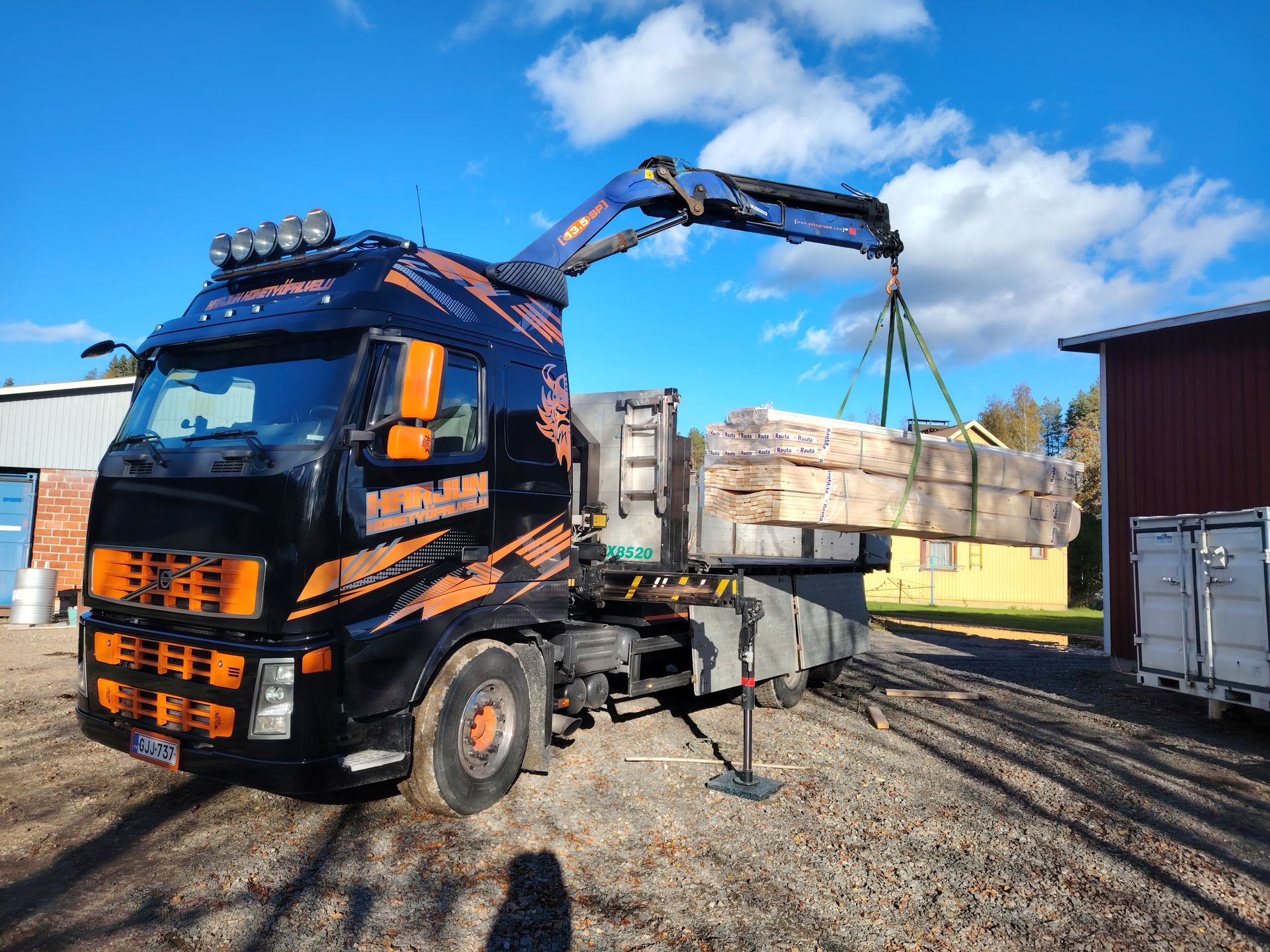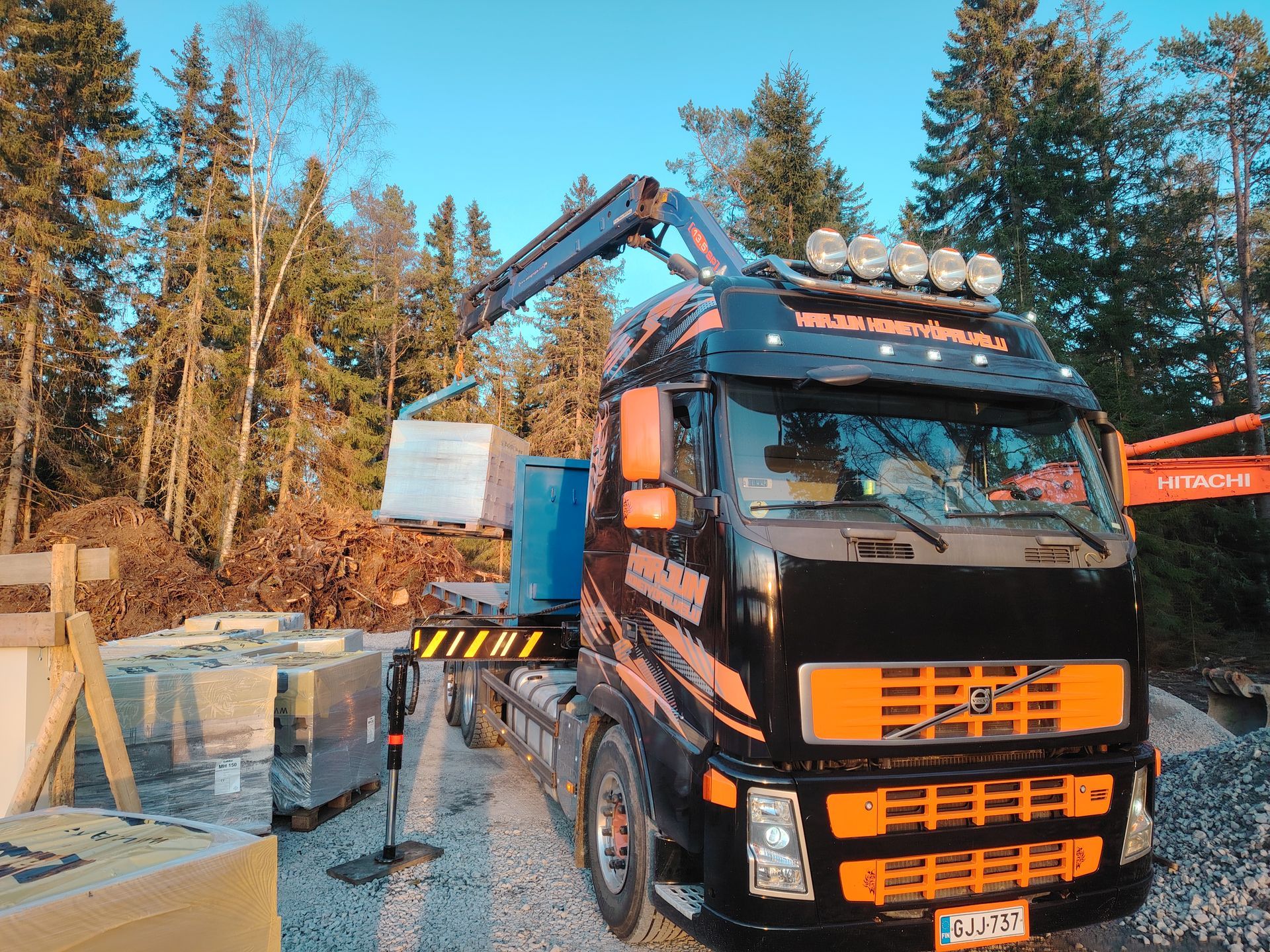 Kuljetuskalustomme taipuu moneen. Toteutamme kuljetuspalveluita nosturilla varustettuun vaihtolava-autoon